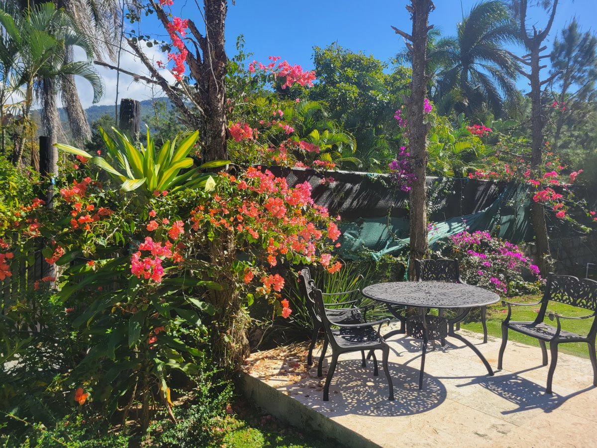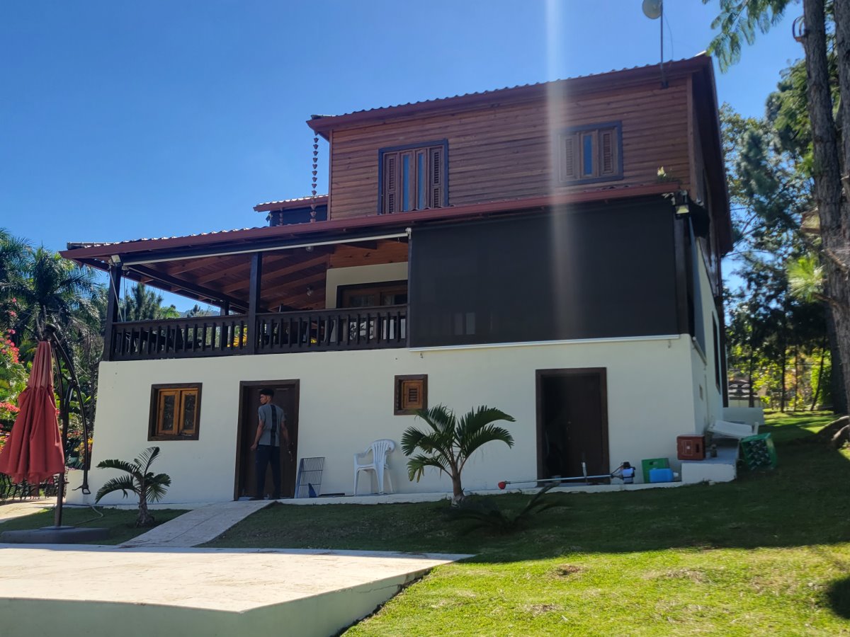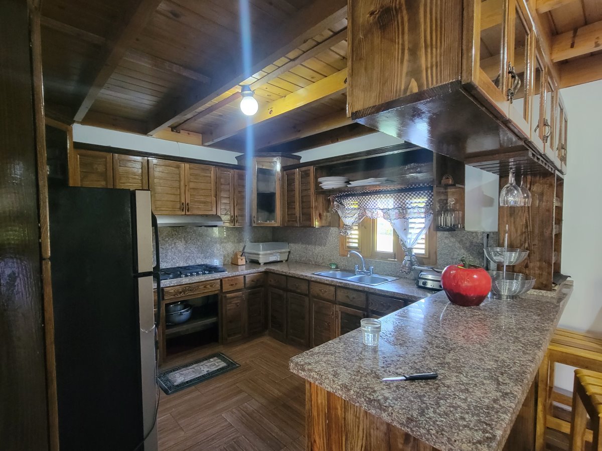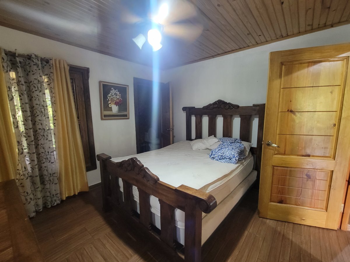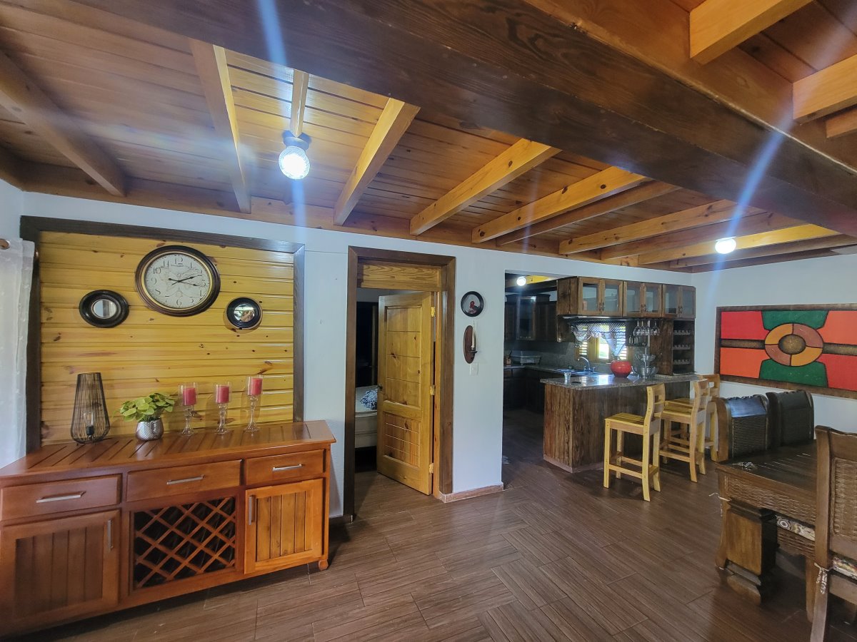 Linda Cabaña de dos niveles con vista hacia la montaña. Sala/Comedor, Cocina 4 Habitaciones 5 Baños Terraza grande Jardín con Piscina Sótano con cuarto de mantenimiento Adicional en construcción una casita para un empleado La venta incluye los muebles. Terreno: 1,600 mts (1,200 con certificado de título; el resto con acto de venta). Amueblada: Si Comunidad cerrada: Si |